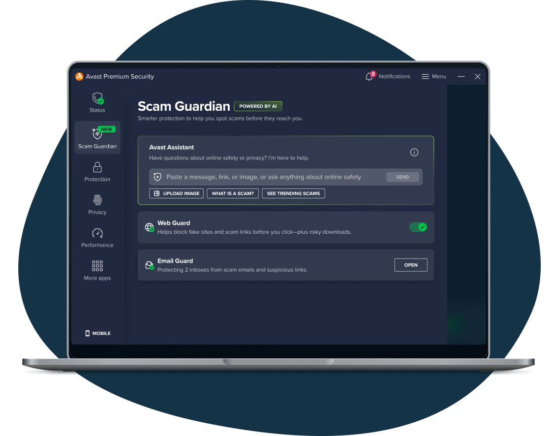 Присоединяйтесь к миллионам пользователей нашего бесплатного антивируса. Повысьте свою готовность к атакам современных киберугроз и мошенников в сети. Получайте рекомендации по защите от мошенничества от нашего нового компонента Помощник Avast, работающего на базе ИИ.